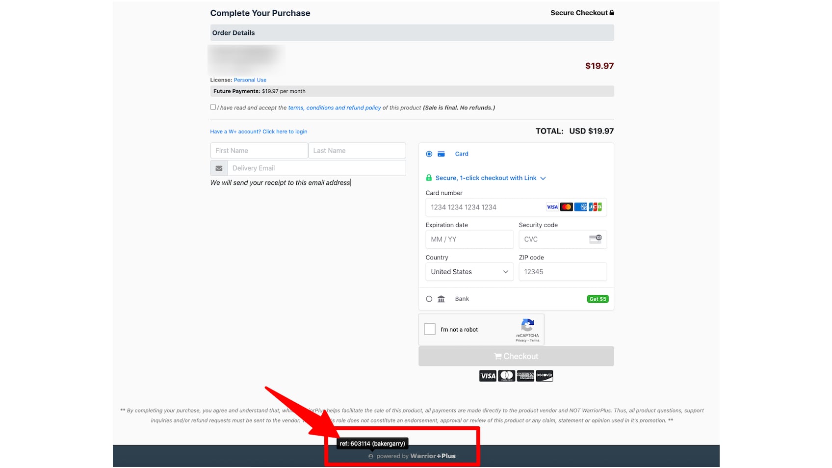 Step #1 - Verify I'm the Affiliate on the Checkout Page ... Hover Over the Profile Icon Next to "powered by WarriorPlus" to Verify My Affiliate ID: bakergarry
